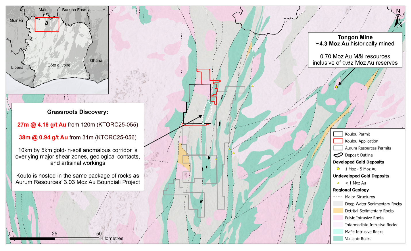 Alex Ruggieri, CEO of Koulou, commented, “The 2025 to 2026 maiden drill results at Kouto confirm another grassroots discovery for our team. Anomalous BLEG results led to defining a 10 by 5 kilometre gold-in-soil anomaly which returned 27.0m at 4.16 g/t Au on the initial test, demonstrating the validity of our exploration model and the productivity of the Boundiali-Syama Greenstone Belt. With multiple high-priority targets at Kouto and across the broader portfolio, we are excited to generate additional value for our shareholders and host communities through systematic exploration and discovery.”
