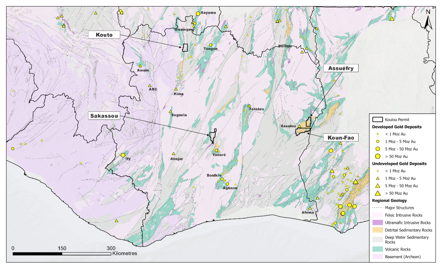 Figure 3. Regional geology with significant gold deposits, and Koulou project locations