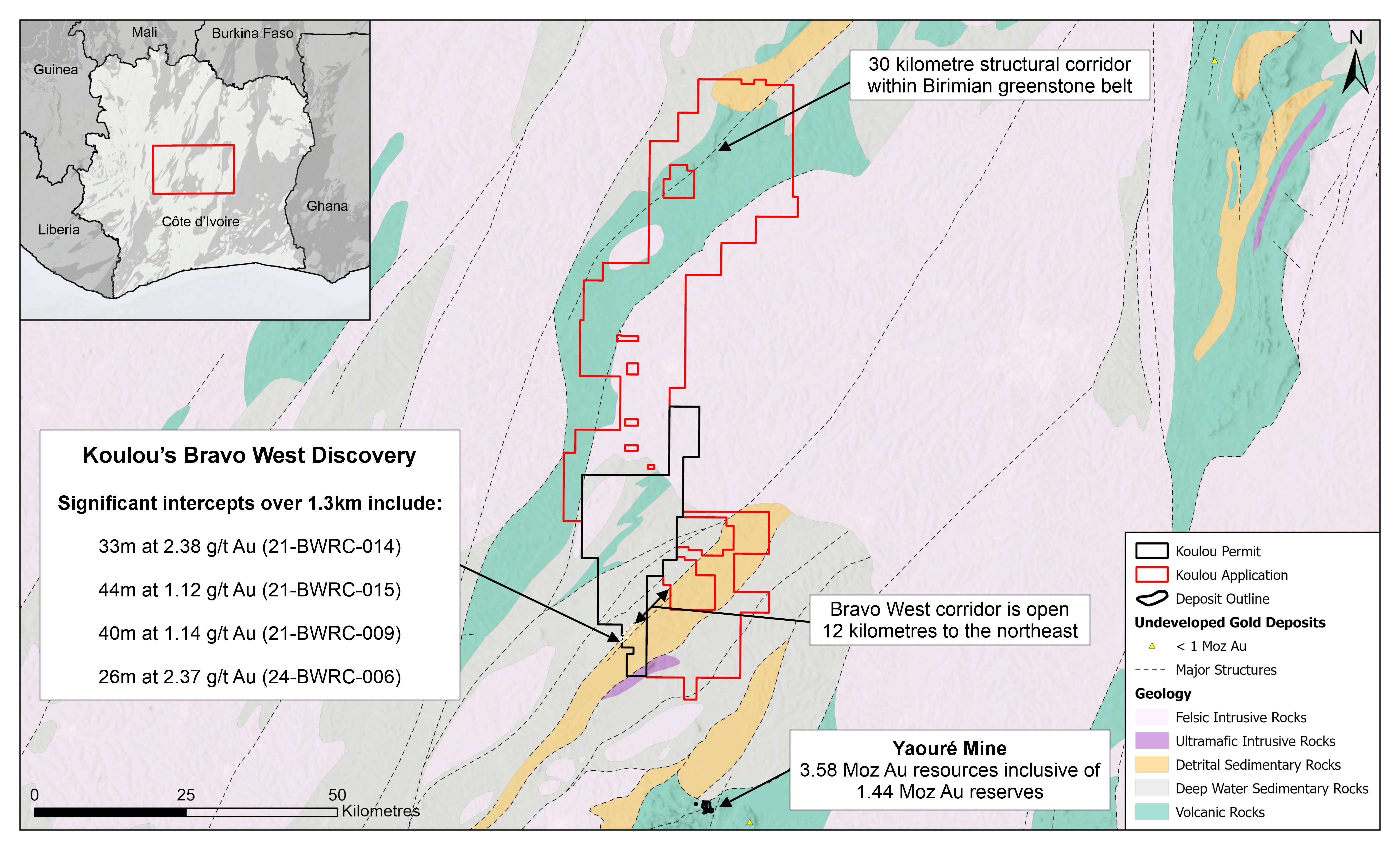 Regional geology showing the Sakassou Project location and Perseus' Yaouré mine (3.58 Moz Au resources inclusive of 1.44 Moz Au reserves)*