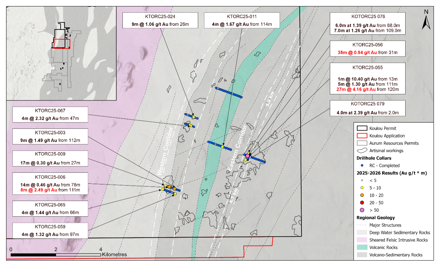 Figure 1. Kouto geology map highlighting 2025-2026 drilling results